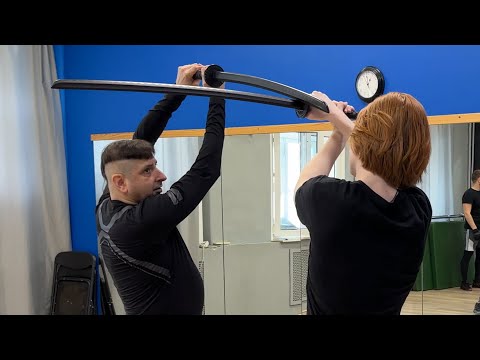 Обучение длинным японским мечом (катана) с двуручным хватом меча (моротэ) стойкам (чудан но камаэ, дзидан но камаэ, гедан но камаэ, хассо но камаэ и ваки но камаэ) и девяти основным защитам в школе японского фехтования Katana Club.