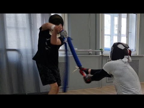 На видео спарринг тренировочным не травмоопасным длинным японским мечом чанбара тёкен, с плоским профилем, имитирующим катана.