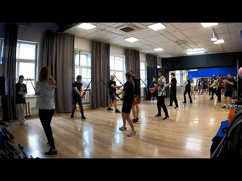 Обучение правильным стойкам и перемещениям при фехтовании, отработка ударов и защит длинным и коротким мечом.