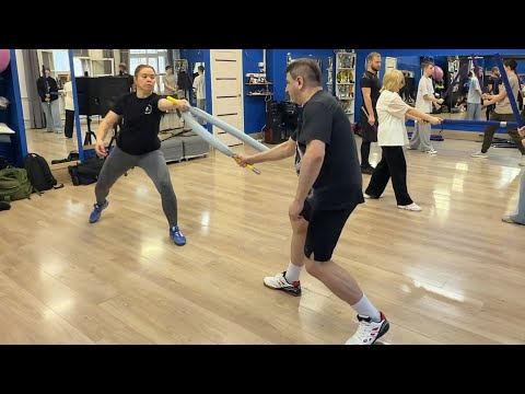 Обучение приему фехтования с полуторным японским мечом (катана) с одноручным хватом меча (катати) финту переводом (ринзоку ни дан вадза) с коротким ударом без замаха по руке (мае саши котэ ко-гири) с фехтовальным шагом вперед (окури аши) в школе японского фехтования Katana Club.